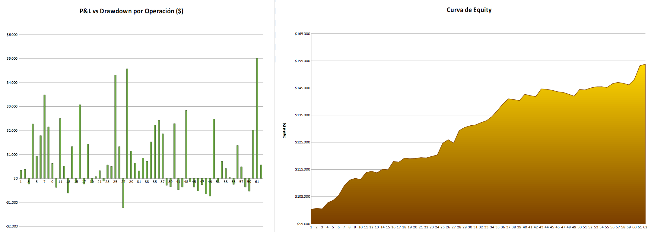 La primera gráfica muestra el P&L por operación — cada barra es un trade. ganancias, pérdidas. Lo que más llama la atención no es la altura de los trades ganadores, sino la contención de los trades perdedores. El drawdown por operación está controlado de forma consistente. Eso no es suerte — es estructura.