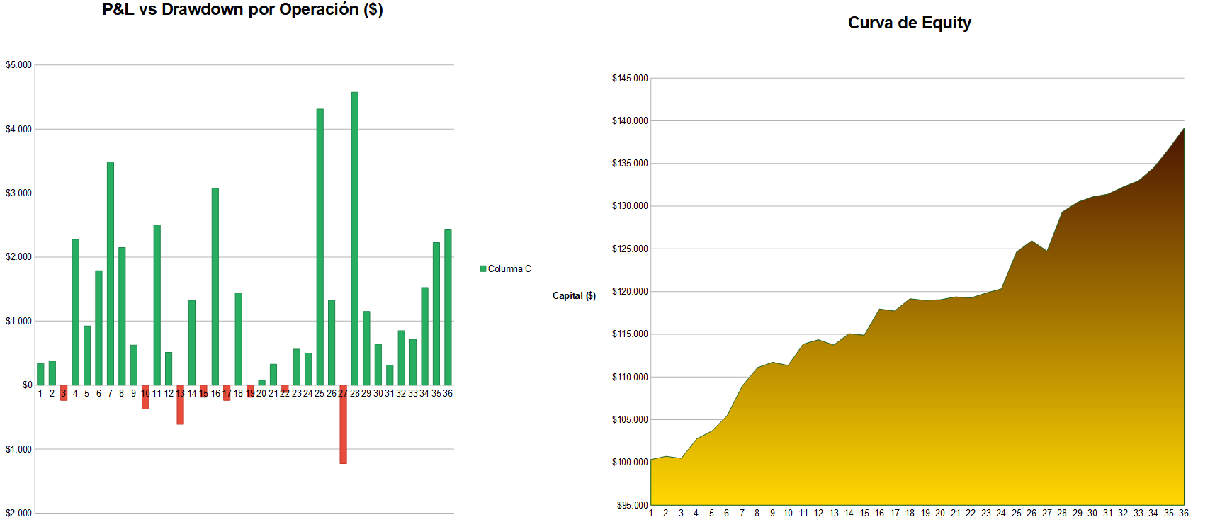 La primera gráfica muestra el P&L por operación — cada barra es un trade. Las verdes son ganancias, las rojas son pérdidas. Lo que más llama la atención no es la altura de las barras verdes, sino la contención de las rojas. El drawdown por operación está controlado de forma consistente. Eso no es suerte — es estructura.